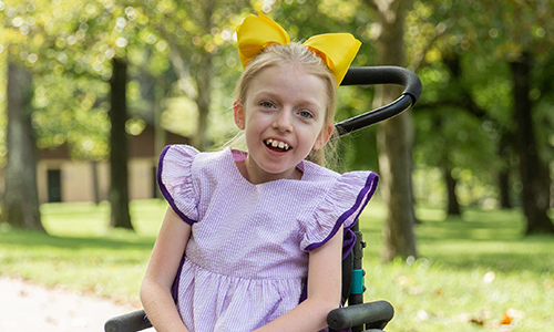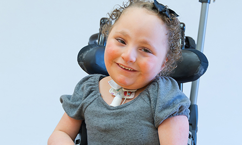 The joy of Kennedy’s birth changed to fear when she stopped feeding and her oxygen levels dropped. After six weeks with no answers at a local hospital, Kennedy’s parents drove 90 minutes to Boston Children’s Hospital, where extensive testing revealed Kennedy had a rare condition where her weak trachea could collapse to block the airway, making it hard to breathe. Her doctor explained that Kennedy needed a tracheotomy to keep her airway stable. After 136 days at Boston Children’s, nine-month-old Kennedy was able to go home. The care team helped the family understand how to access benefits for children with complex medical needs, including the care of an at-home nurse. Six years later, Kennedy visits Boston Children’s for check-ups and is making great progress, working toward being able to walk on her own. Kennedy is a proud big sister and loves music and seeing her friends at school.