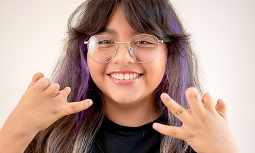 Melody was born with a rare congenital condition where string-like bands of tissue wrap around fingers and toes. Amniotic band syndrome is non-preventable and affects one in 15,000 births annually. Melody faced her condition with grace and her family was referred to Children’s Hospital Los Angeles, where she has received comprehensive support. To date, Melody has had four surgical procedures to separate her fingers and remove excess skin to improve her hands’ functionality. Today, Melody proudly tells people about her unique hands. She loves doing art and celebrates her uniqueness.